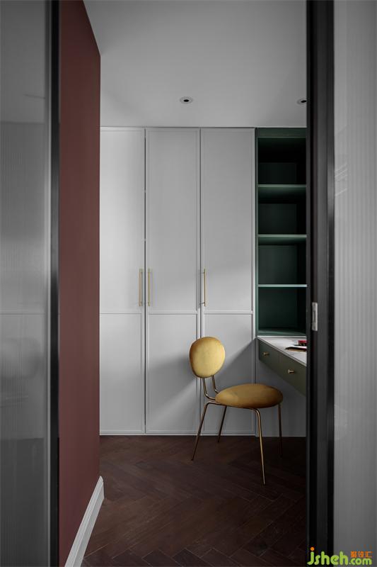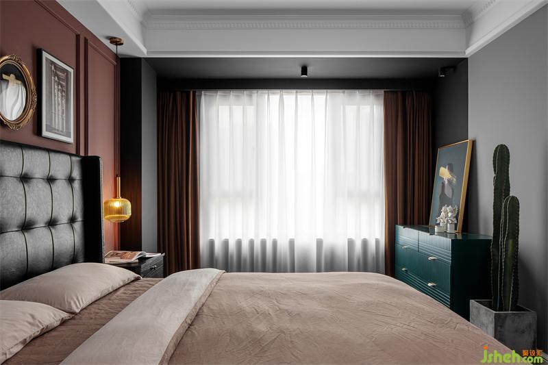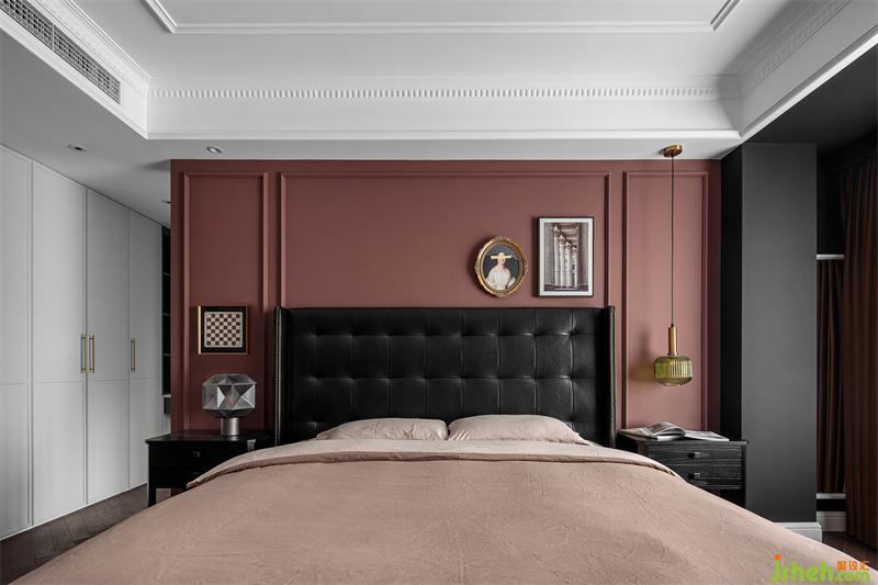 設(shè)計師基于對簡約空間的追求,色彩上,臥室選擇淺一點(diǎn)的豆沙紅與深黑色,局部點(diǎn)綴墨綠色,沿用了客廳一貫的撞色法,生動而有趣。