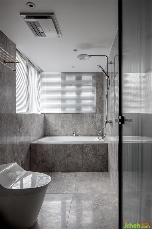 主衛(wèi)灰白色系讓整個空間簡單而利落,除了頂部的浴霸,家居設(shè)計了射燈,達(dá)到最大的照明功能。百葉窗式的簾子與花巖色的瓷磚營造出舒適的氛圍。