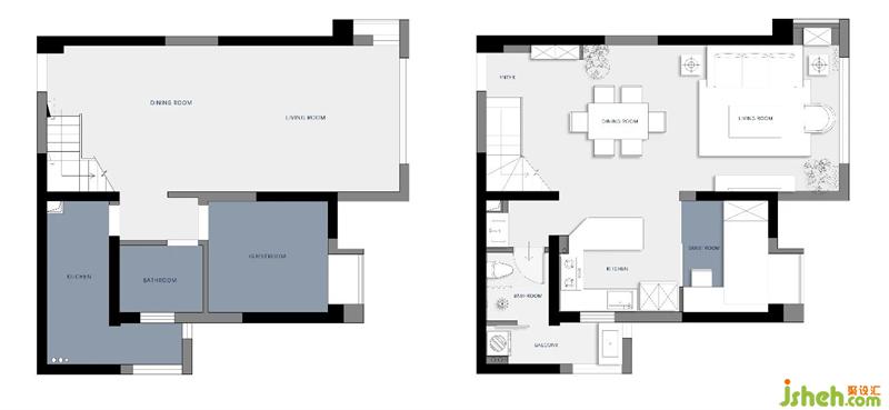 ?原房規(guī)劃的衛(wèi)生間區(qū)域較小,且廚房區(qū)域與餐廳分離較遠,一樓整個公共區(qū)域相對狹長。改造后廚房與衛(wèi)生間對調(diào),將廚房區(qū)域向外擴張,在保夠客房的同時,開放式的廚房將廚房與餐廳巧妙的連接在一起,增大了空間視覺感同時提高了空間利用率。衛(wèi)生間也實現(xiàn)了干濕分區(qū)。