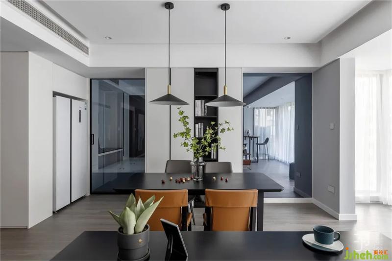 我們?nèi)∠筒蛷d之間原有推拉門(mén),客餐廳與陽(yáng)臺(tái)區(qū)域的分隔也被打開(kāi),讓原本較窄的陽(yáng)臺(tái)空間更好的融入客廳。同時(shí)把陽(yáng)臺(tái)封裝成幾面超大的落地玻璃,讓整個(gè)空間更為通透和寬敞,讓就餐空間不再單調(diào)。