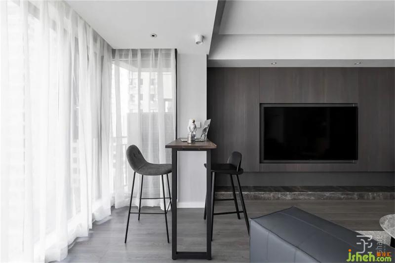 客廳打破了傳統(tǒng)格局,打通陽臺,在靠電視墻一處設(shè)計(jì)了小吧臺,讓屋主在這里簡單的辦公、喝茶、聊天等。陽臺放置一個慵懶的沙發(fā),在周末陽光灑進(jìn)來時可以看看書,或練練瑜伽。