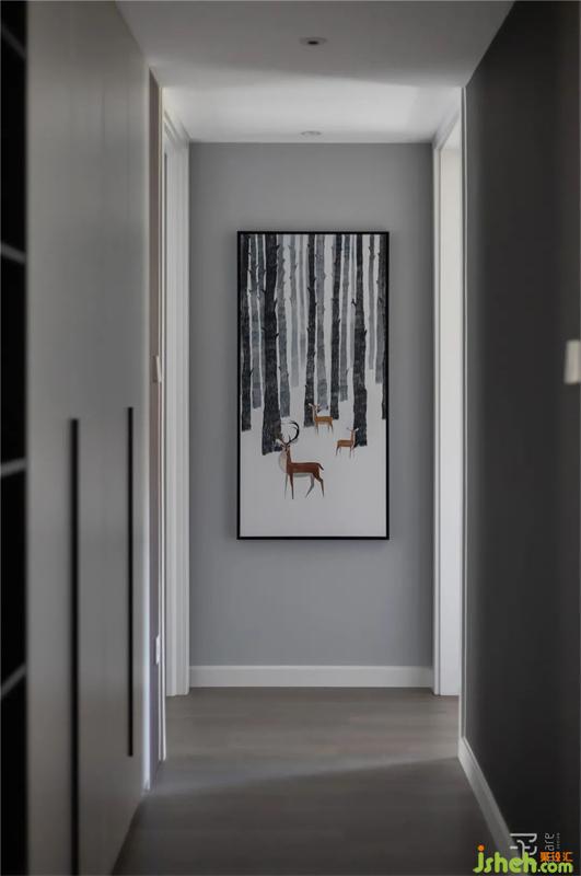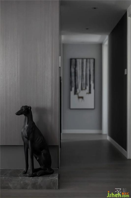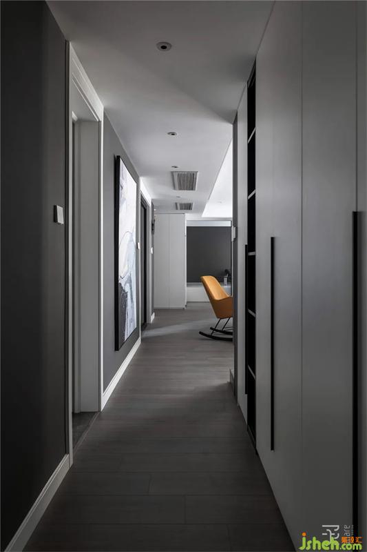 過道空間的墻面空間做成與衣帽間相鄰的雙面柜,一面為衣帽架的衣柜,一面為雜物柜兼部分展示柜功能。