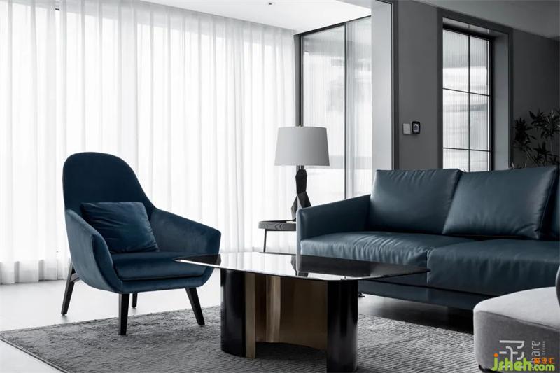 客餐廳連通的空間設(shè)計極大的滿足了業(yè)主對于空間尺寸的需要,入眼即是被稱作理想之藍的 Klein Blue,沉靜而雅致的色彩搭配展現(xiàn)著超強的吸引力。