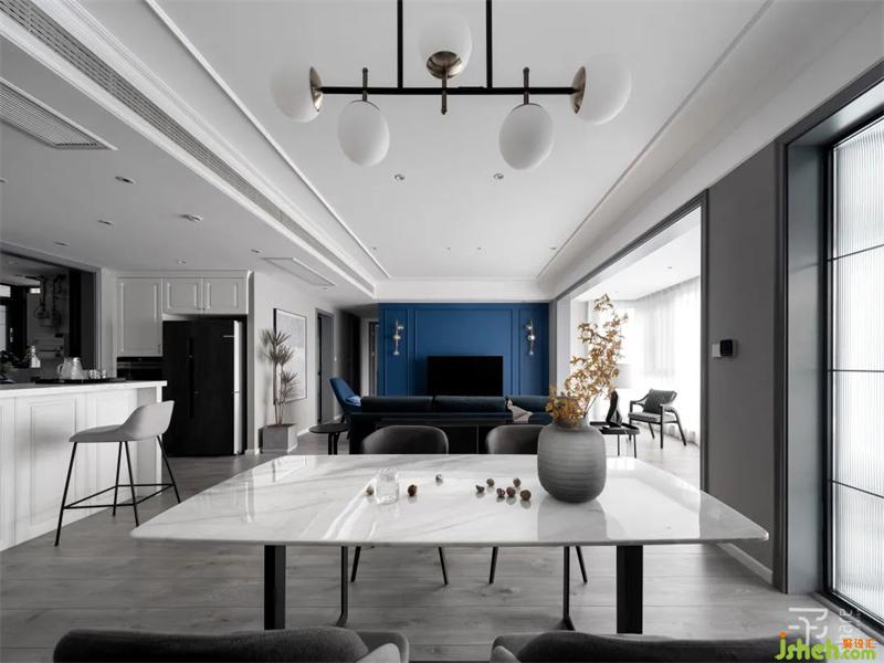 克萊因藍以其冷麗清亮的色調(diào)在大面積應(yīng)用時能帶來恢弘的高雅氣勢,成都家居設(shè)計結(jié)合著用于點綴空間的黑白色調(diào)的畫幅,富有著獨特視覺沖擊,白色大理石桌面光亮的質(zhì)感所營造出的時尚奢美質(zhì)感更是令人驚艷。
