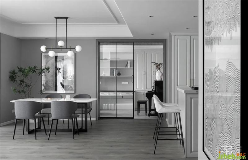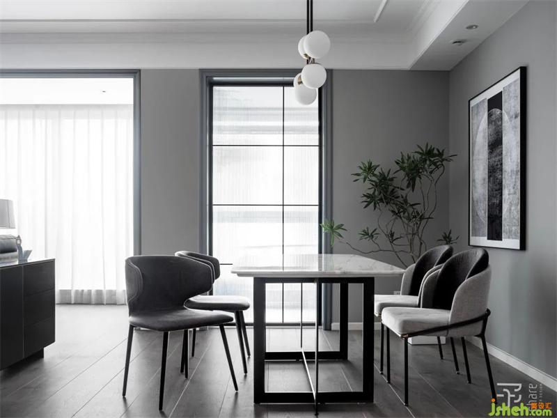餐廳空間與西廚的一體化的設(shè)計,使得整個空間柔和的交融在一起,富有層次感的灰調(diào)中點綴著的淡淡的綠色,整個空間便活了起來。亮面的大理石餐桌臺面搭配布藝的餐椅及設(shè)計感的黑白裝飾畫,餐廳的高級感油然而出。