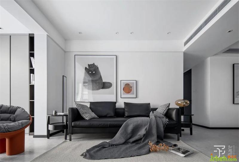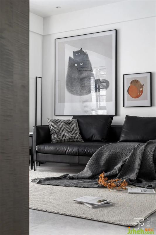 黑色皮質(zhì)沙發(fā)搭配深色邊幾,簡潔純粹,采用的無茶幾的設(shè)計方式,無形中放大了空間。