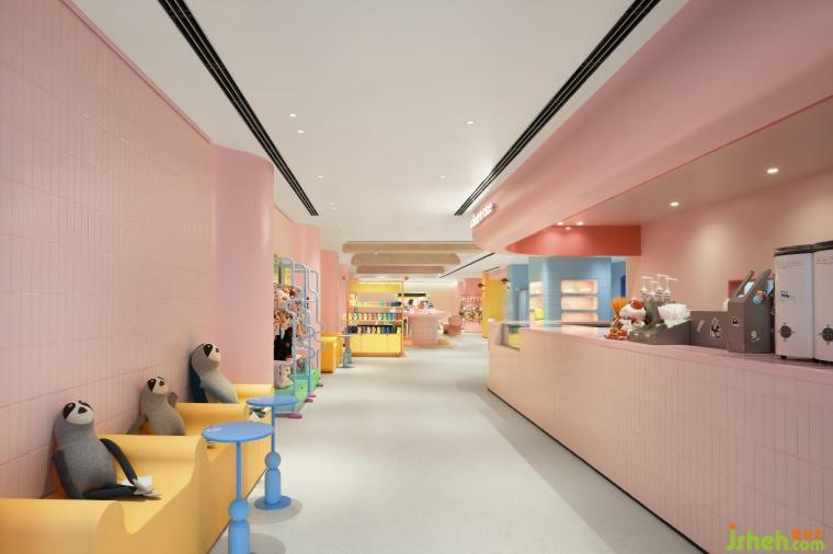 步入店鋪,右側(cè)就是一個溫暖柔和的咖啡區(qū)域。這里不僅是一個提供飲品的場所,更是品牌營造沉浸式體驗(yàn)的起點(diǎn)。粉色瓷磚包裹的弧形吧臺,與整體空間色彩和諧統(tǒng)一,形成治愈且夢幻的視覺效果。
