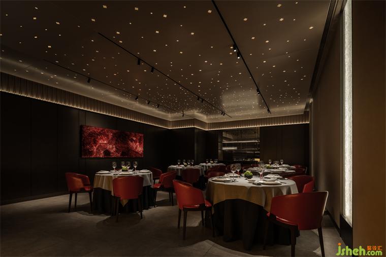 宴會廳頂部則隱藏著另一個世界,漫天星光以柿花的形態(tài)呈現(xiàn),稍顯不真實的朦朧浪漫之感,行走其中,仿佛和現(xiàn)實生活中的鋼筋水泥相隔離,實現(xiàn)獨特的就餐體驗。