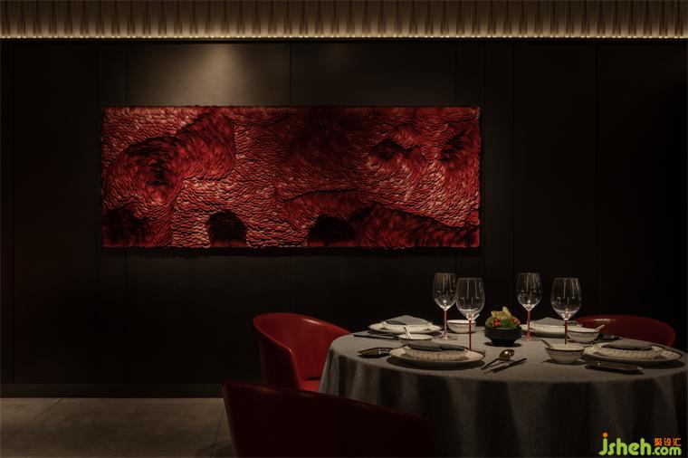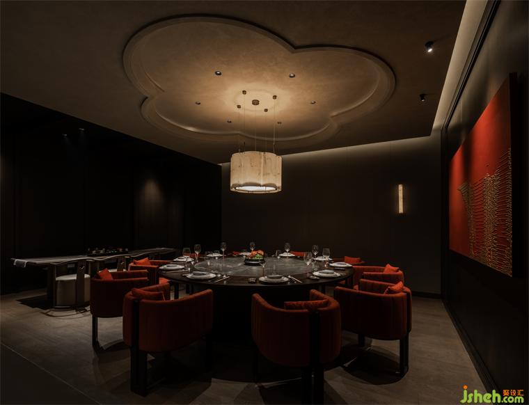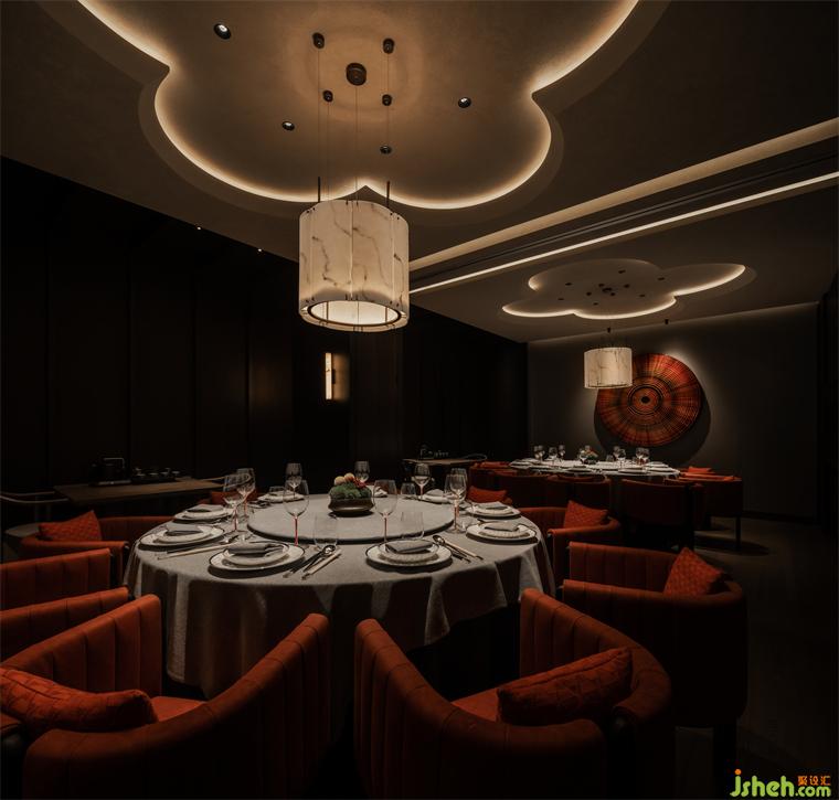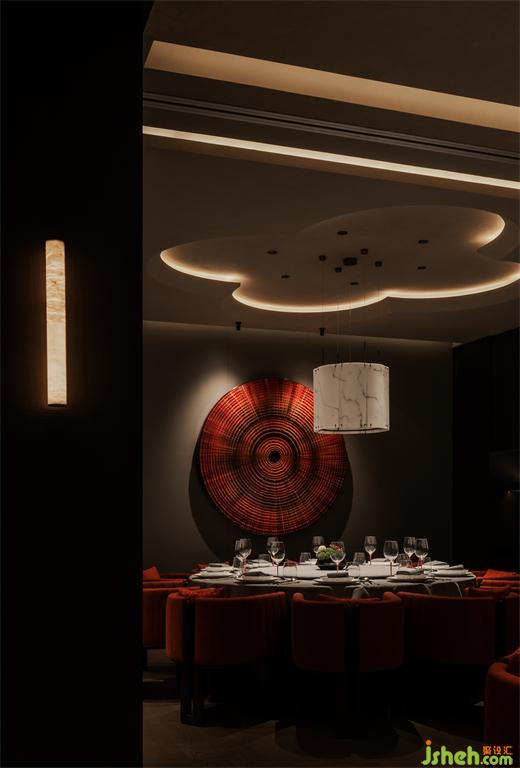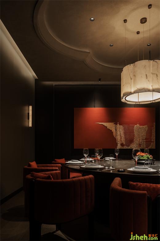 節(jié)奏清晰的空間動線排布,串聯(lián)為彼此貫通的區(qū)域。餐廳設(shè)計包房內(nèi)的柿花形態(tài)頂部和云石材質(zhì)的吊燈交相輝映,為空間注入別樣的藝術(shù)氛圍。室內(nèi)的藝術(shù)品和紅色鋸齒紋椅搭配,給予包房內(nèi)獨特的個性美學,讓其成為一個神秘的小世界。