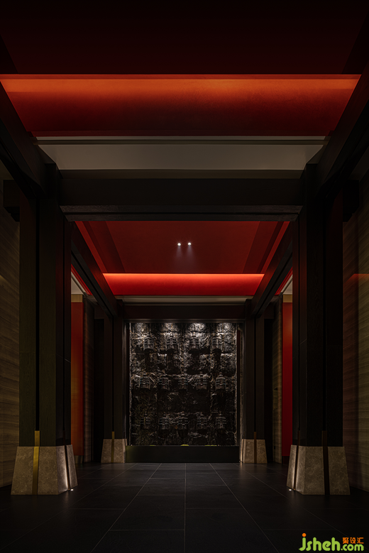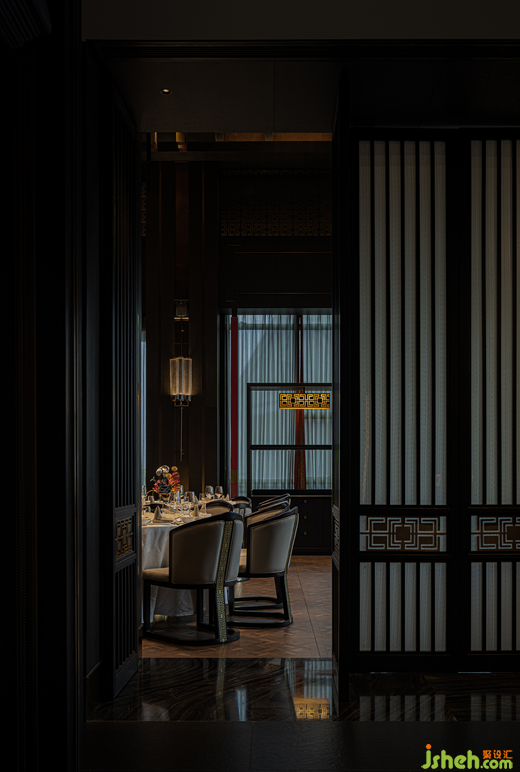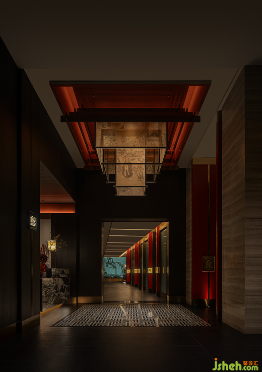 大廳以“章華”為名,天花構(gòu)架以傳統(tǒng)斗拱為靈感,取其結(jié)構(gòu)之美,用現(xiàn)代手法重新演繹,賦予空間十分考究的內(nèi)涵氣質(zhì),再現(xiàn)傳統(tǒng)建筑的結(jié)構(gòu)美學(xué)。
