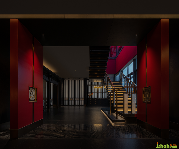餐廳設(shè)計(jì)前廳梁橫柱直,陣列式的排布不自覺(jué)呈現(xiàn)出儀式與莊重,一步一景中將人引入戰(zhàn)國(guó)時(shí)期的熱鬧喧囂。