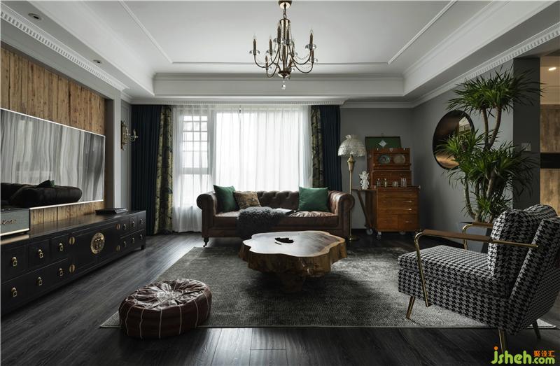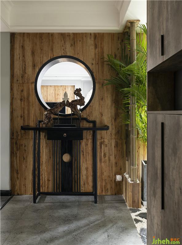 本案例中,室內(nèi)設(shè)計師采用以暗淡的灰、黑色系為渲染的色調(diào),移步于景,入戶端景墻處以中式中心對稱及框景手法,仿佛電影中鏡頭,捕捉圓環(huán)背面景色,墻面采用飽和度高的暖色老木板,側(cè)面引入戶外竹子與綠植,冷暖色系交相呼應(yīng),光與影的介入,給整個畫面提升視覺沖擊感,竹子下方門檻引入日式“枯山水”,青石板與白色鵝卵石搭配細節(jié),讓人心靈更加安靜與自然。