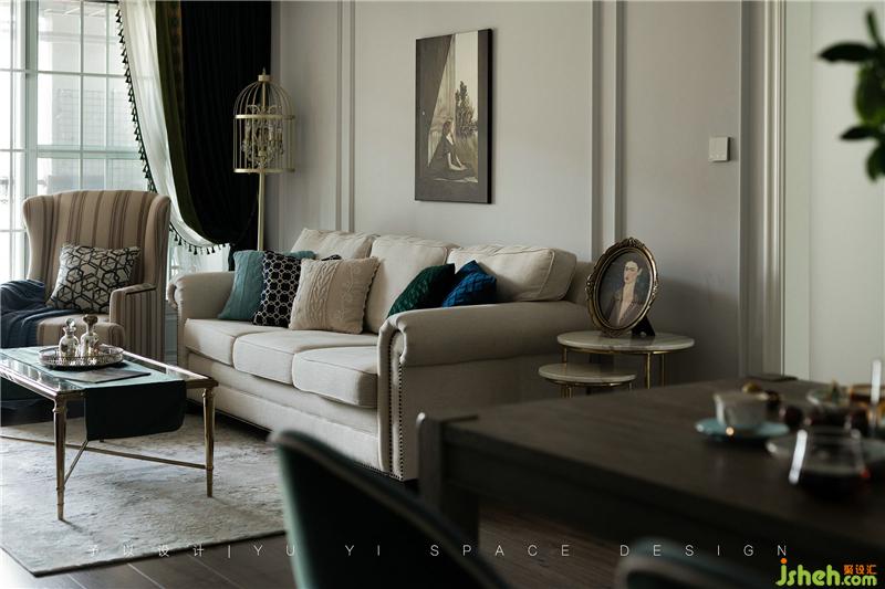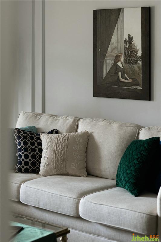 整齊有序的物件陳列映襯出屋主精致的生活狀態(tài),深藍、深綠色的抱枕與淺色的布藝沙發(fā)在色相與明度上交相呼應,并形成冷暖色系對比,仿佛油畫里的筆觸,和諧、寧靜。