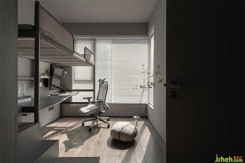 兒童房通過(guò)梯柜與高床垂直空間的利用,利用下方空間設(shè)計(jì)辦公書(shū)桌區(qū)域,并且釋放出兒童房地面空間,充分利用每一平空間尺寸。