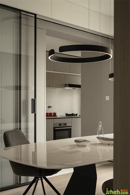 餐廚空間運(yùn)用大面積的巖板,在結(jié)合整體氛圍滿足功能使用的同時,讓空間的形體表現(xiàn)得更有節(jié)奏感。