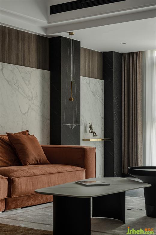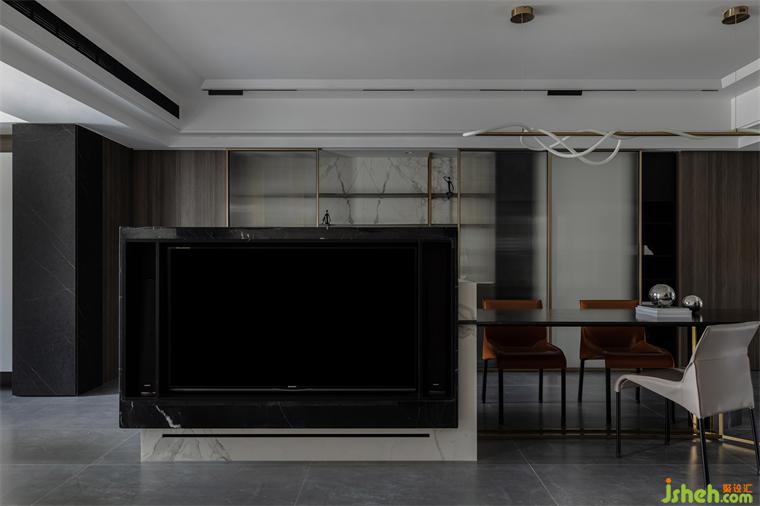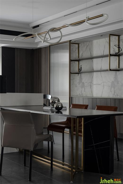 金色、銀色金屬材質(zhì)與板材、巖板、石材材質(zhì)進行碰撞,讓空間質(zhì)感增強。