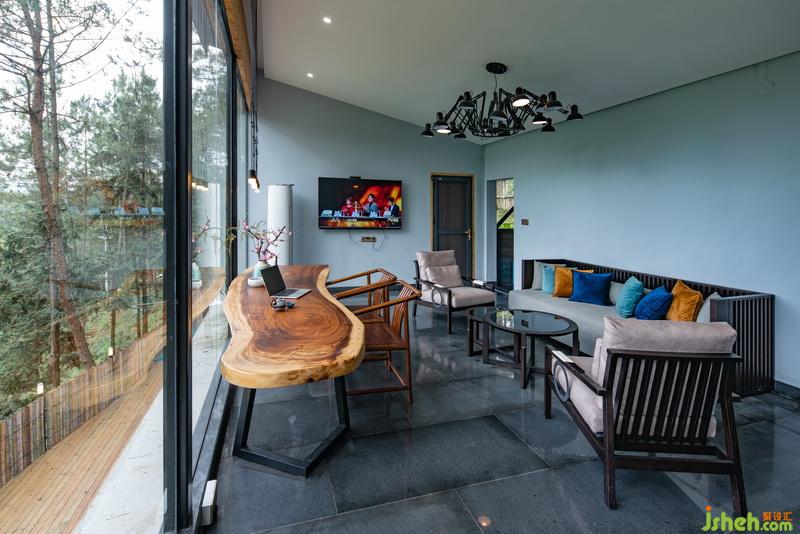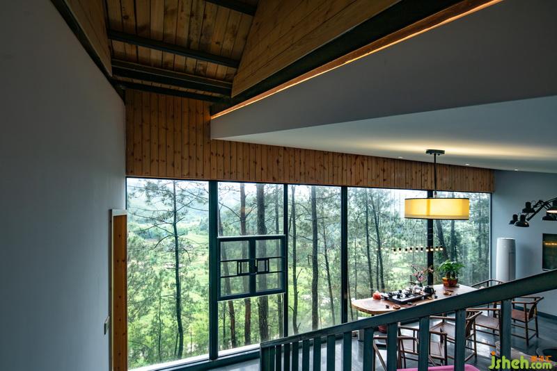 依山而建的兩層小木屋,將每個空間都融入到松林樹梢的奇特感受里。把最好的觀景方向是全落地玻璃,鄉(xiāng)野風(fēng)情盡入眼底。