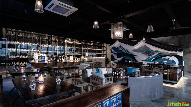 Stepping into the interior, the exposed white stone wall and cement floor match each other to spread a layer of simple background color. The black graffiti like flowing lines are applied to the log chairs and benches. The white cement wall is wrapped on the wall to form a special gray and dark texture. The designer has extracted the gray tiles and white walls, which symbolize the Hui school's characteristics; the flying murals are derived from the exploration of the Chinese world, which is a mixture of casual indulgence and calmness, which reminds every dormant person who comes here.