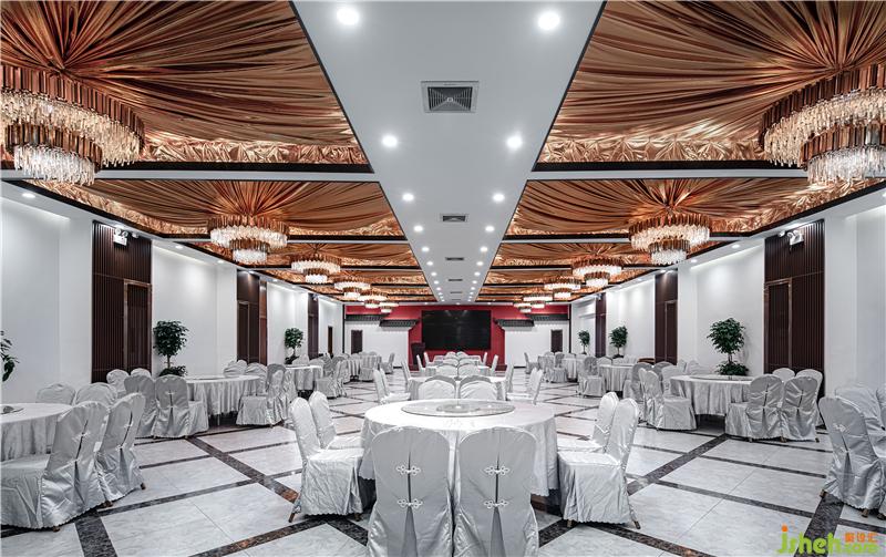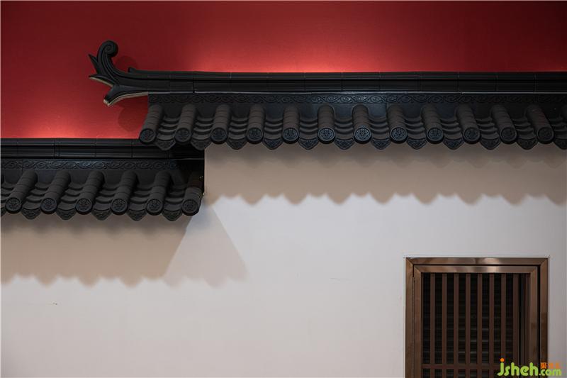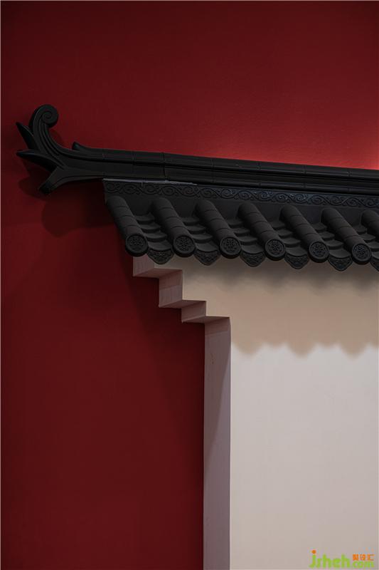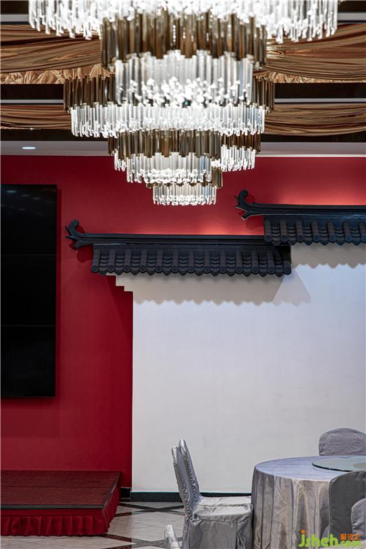 精致的鎏金天花搭配以大塊面的白色,古時(shí)的村頭戶外采用喜慶的紅色,消融了實(shí)有的空間隔閡。
