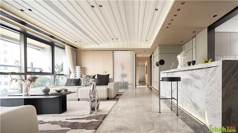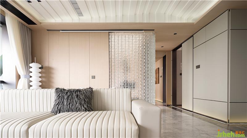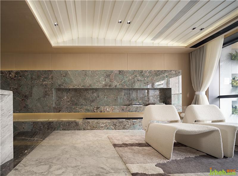 整個空間建構(gòu)是現(xiàn)代的、簡潔的體塊穿插,陳設(shè)與色彩的細(xì)膩帶給人一種內(nèi)心豐實感。蘇州樣板房設(shè)計與亞馬遜綠大理石造型相對應(yīng)的是視線移至品鑒室玻璃磚墻透出的光束,隔而不分的圍合給人一種被擁抱的感受,創(chuàng)造一種親切、充滿人情味又不失私密的洽談環(huán)境。
