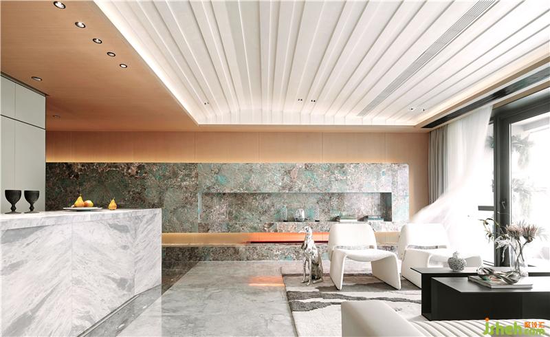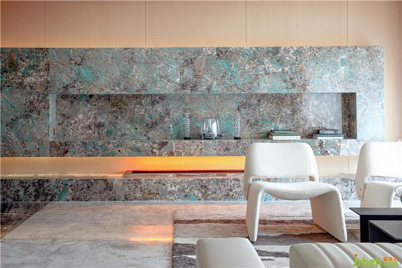 旁側(cè)的亞馬遜綠石材造型元素,仿若置身于熱帶雨林中,形成視覺中心的能量,空間因此被“激活”。
