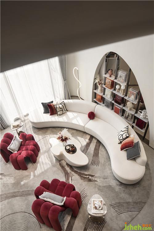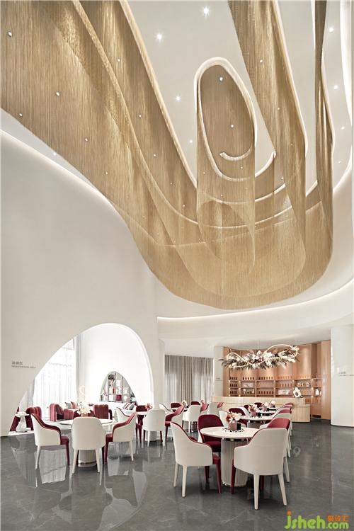 深恰區(qū)打造弧形半圍合洞穴空間,在風(fēng)格上依舊延續(xù)了前廳的現(xiàn)代簡約的體驗感。