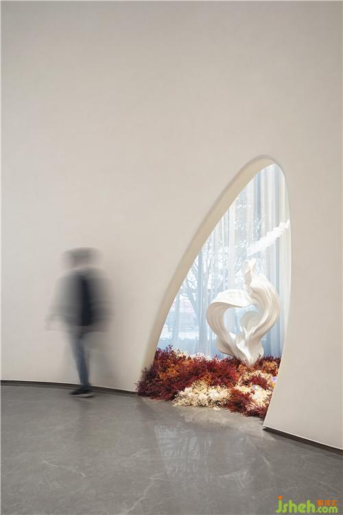 空間引入“花”主題雕塑營造浪漫氛圍,設(shè)計希望通過空間與人之間的互動產(chǎn)生新的碰撞。