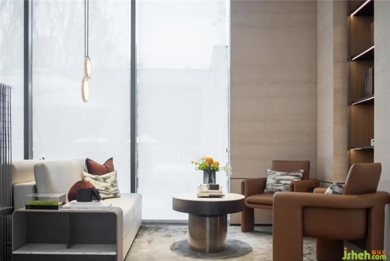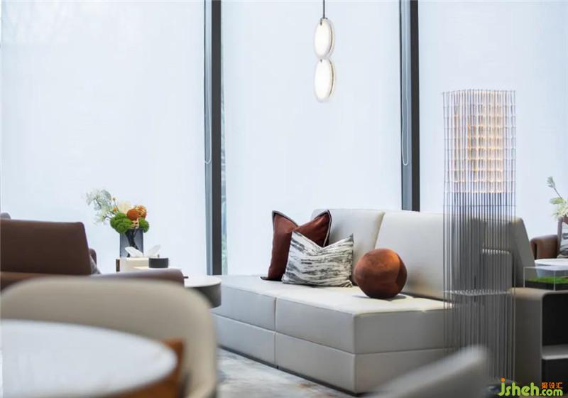 大面的落地窗戶將室外自然水景最大引入,在光線的折射下構(gòu)筑自然與室內(nèi)、與人之間的觀感互動。
