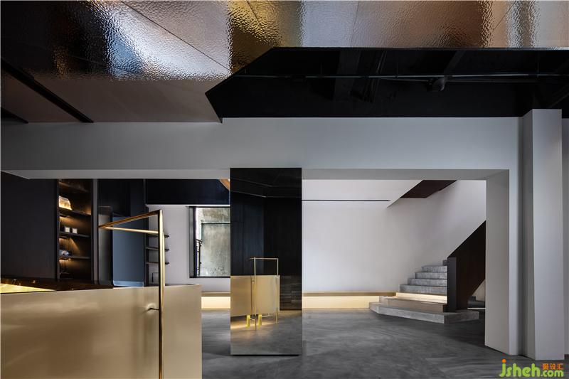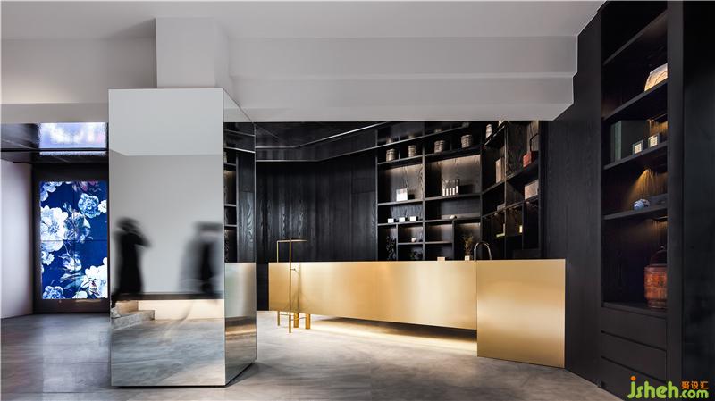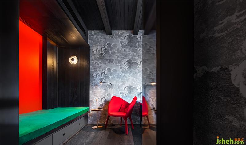 整個(gè)區(qū)域以黑色打底,其間置入一抹鮮明,如黃色座椅,在光線的輔助下,沖突也和諧。