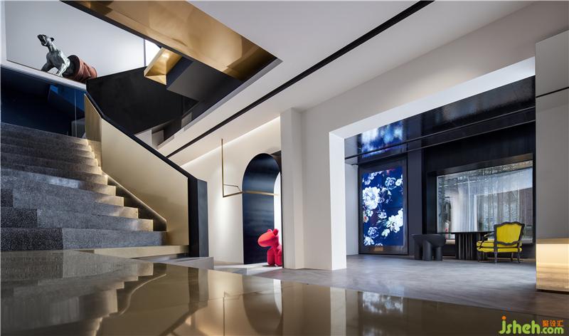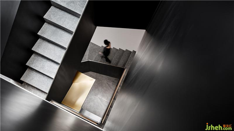 在二樓和三樓之間還置入了懸空的紅色箱體,作為收尾。整個(gè)空間變得有意思起來(lái):金屬、石材、布藝,私密與開(kāi)放兼具,營(yíng)造一種極致的美學(xué)體驗(yàn)。