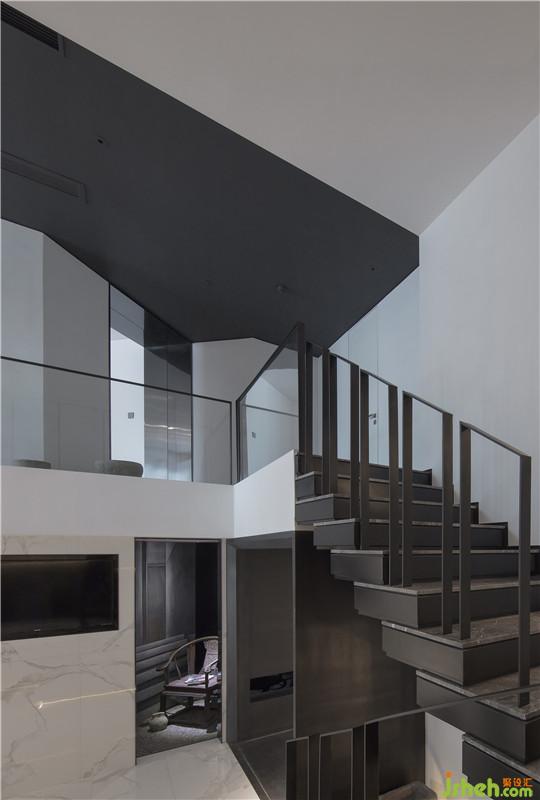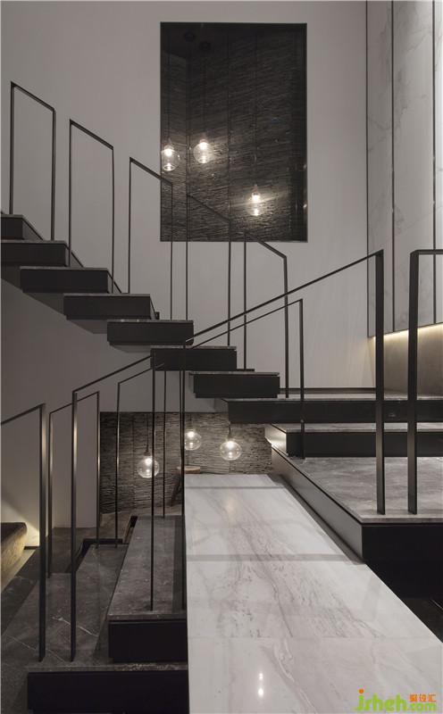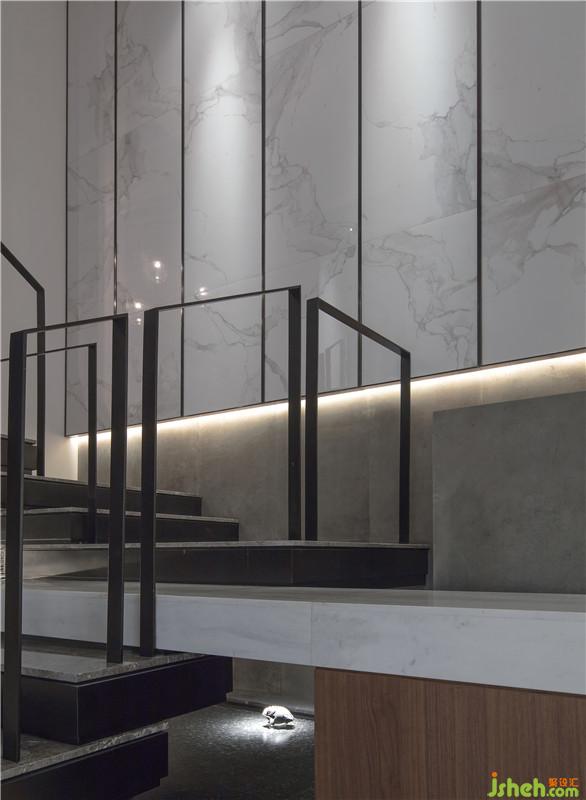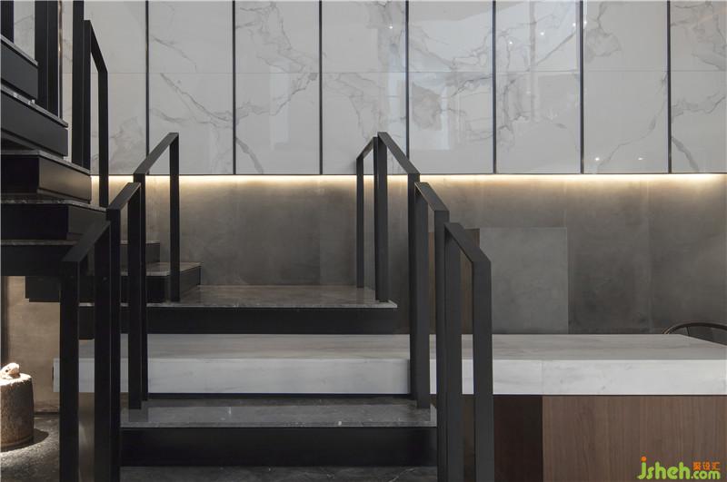 大廳的鋼構(gòu)樓梯是本次設(shè)計的一個重心,同時也是一個施工難點。經(jīng)過反復(fù)推敲結(jié)構(gòu)層次,把樓梯踏步石材延伸為前臺臺面,同時將其端口作為水景瀑布的出水口,在滿足了使用功能的前提下更像是一件融入空間的藝術(shù)品。