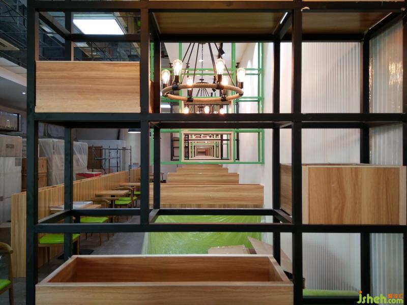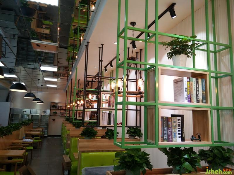 雅座區(qū)上方綠色裝飾架,呈陣列排布,劃分空間同時(shí)增加空間層次與藝術(shù)美感,吊頂中間銀鏡裝飾,拉伸空間同時(shí)增加魔幻與現(xiàn)代時(shí)尚感。頂面高色溫LED平板燈,墻面高色溫滑軌射燈以及就餐區(qū)上方低色溫吊燈,冷暖對(duì)比,層次分明,整體燈光給空間增加了蓬勃的生氣。室內(nèi)設(shè)計(jì)師