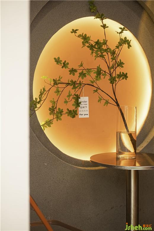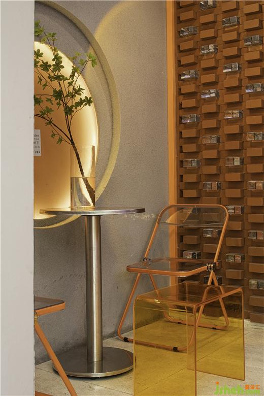 從巷子走過便能看見入口處設(shè)計的一處專門為現(xiàn)代年輕人設(shè)計的小型打卡區(qū),油炸店設(shè)計用紅磚和玻璃磚結(jié)合壘砌的墻體,紅磚溫馨、靜謐,玻璃磚則隱約透出室內(nèi)的煙火氣,頂面的日落燈灑在背景圓洞的造型上,加上暖黃色的燈帶,如日落的太陽。僅入口處所營造的氛圍感便讓人忍不住頓足,還未進(jìn)店便已經(jīng)感受到濃烈的市井溫情。