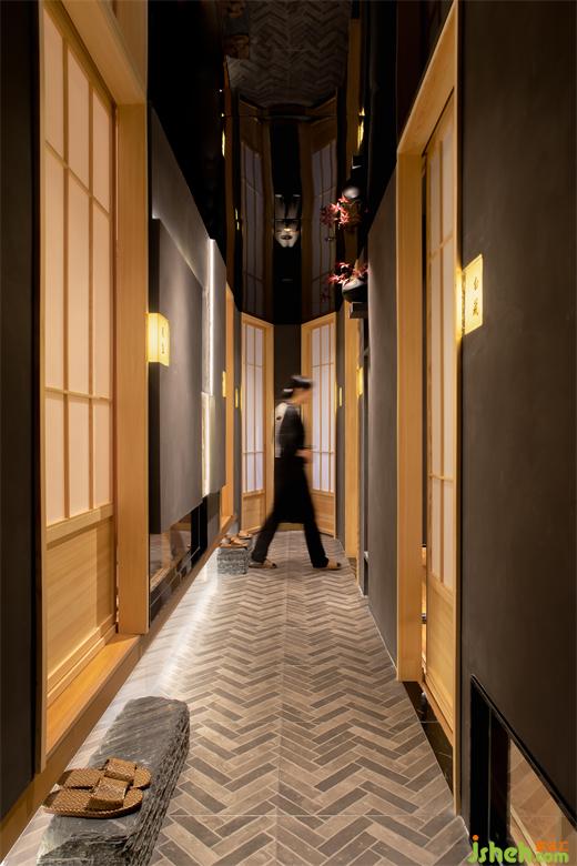 明檔處延續(xù)門(mén)頭設(shè)計(jì)手法,采用毛筆字搭配燈箱設(shè)計(jì),燈閣在日本文化寓意著希望、幸福和祈福,與遒勁的雲(yún)川字體交織,心向雲(yún)端,俯望山川。傳統(tǒng)書(shū)法與現(xiàn)代日本料理文化相融合,文化中和的趣味令人回味無(wú)窮。