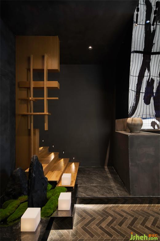 一樓樓梯處,一座山景,大小分明,高低錯(cuò)落,自由靈動(dòng),粗糙石材與精致木材碰撞形成視覺(jué)焦點(diǎn)。黑色透明亞克力為城,圍著一株姿態(tài)靈動(dòng)的花木,花木無(wú)言,自述淡雅閑情。