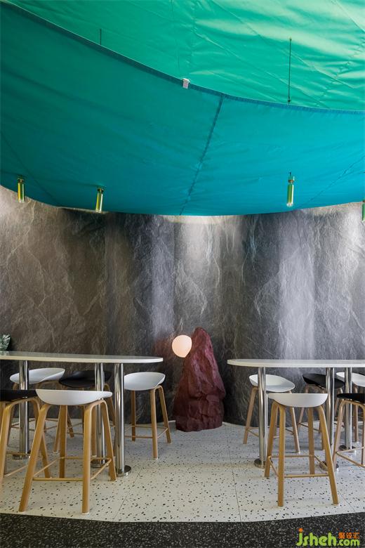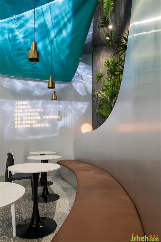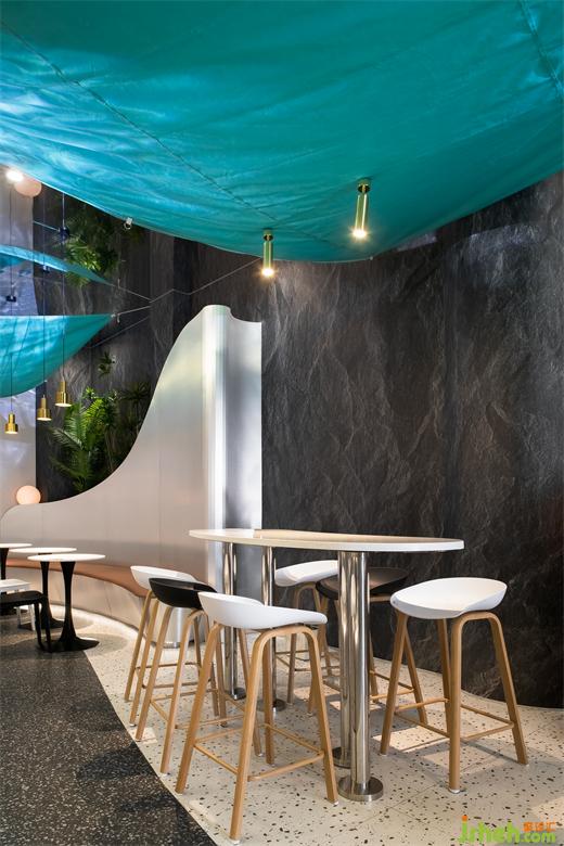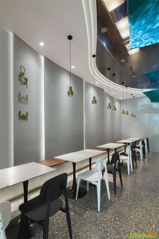整個(gè)外門(mén)面以海水藍(lán)為品牌色,呼應(yīng)海洋文化。由于門(mén)楣較大,所以未做過(guò)于繁雜的造型,材料以米白色肌理漆為底,簡(jiǎn)約大氣,米線店設(shè)計(jì)重點(diǎn)突出品牌LOGO。整個(gè)門(mén)頭抓人眼球,十分醒目。