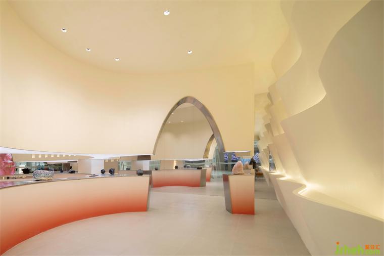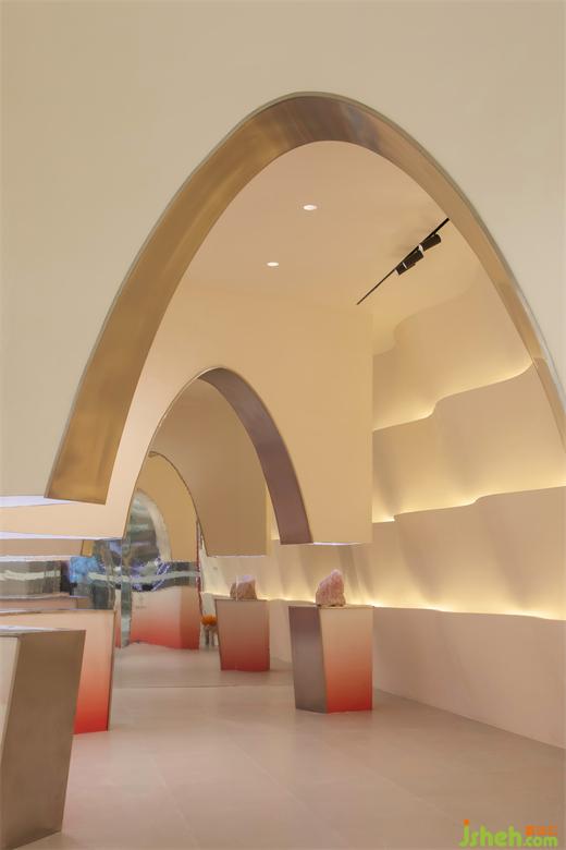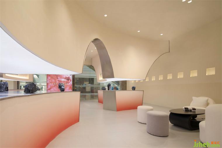 暈染是一種屬于中國傳統(tǒng)繪畫的技法,特點為山水淋漓自然,尤其是霧靄層層。我們提取了暈染的特點用于空間,展廳設計將原本看似毫不相干的各種材料巧妙地融合在一起,猶如藝術的碰撞,點燃了空間中不同元素間的火花。