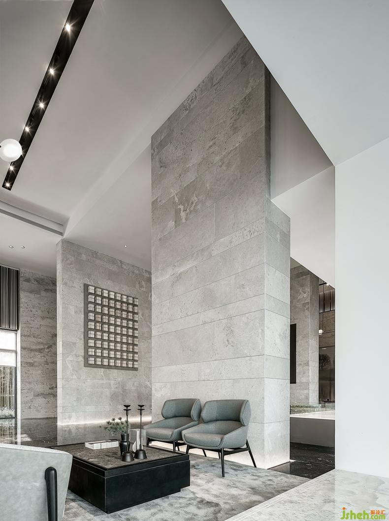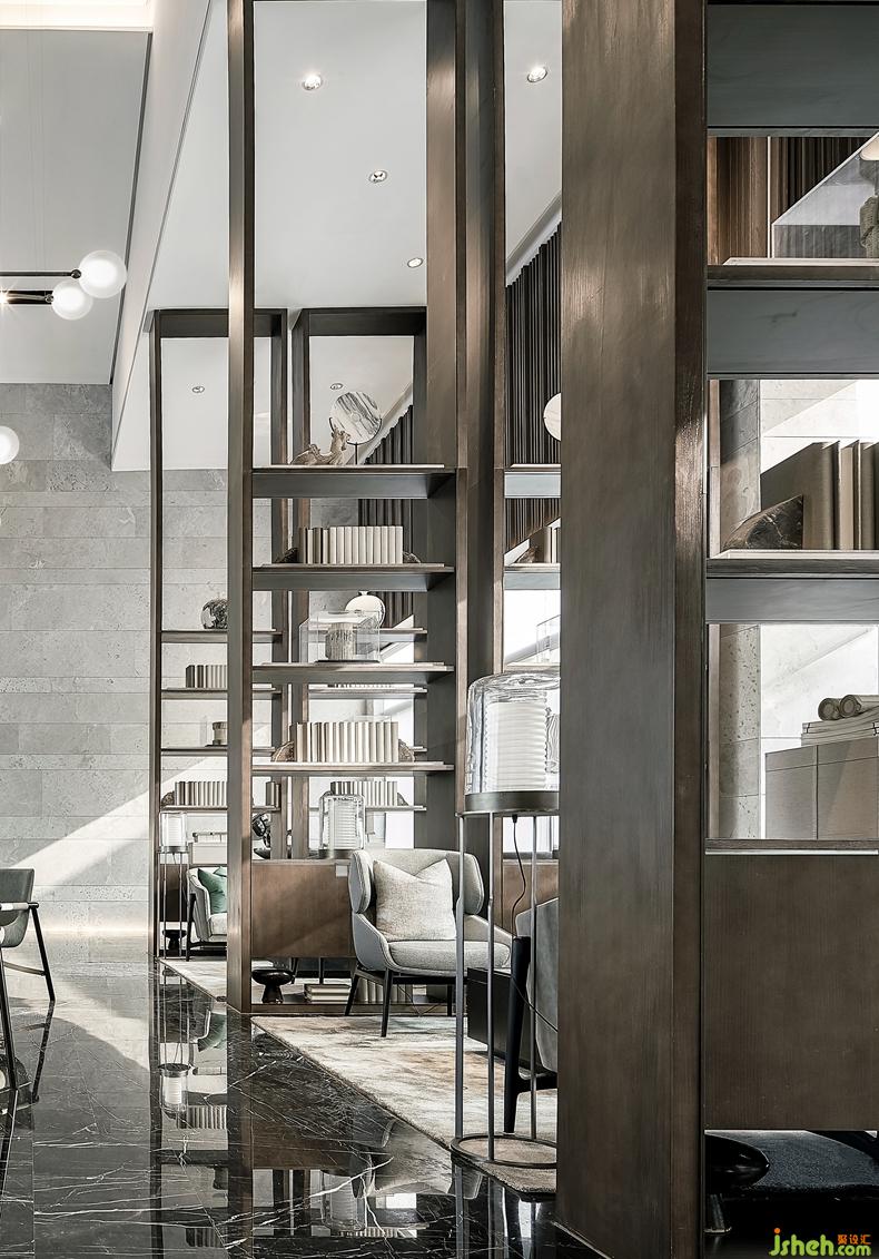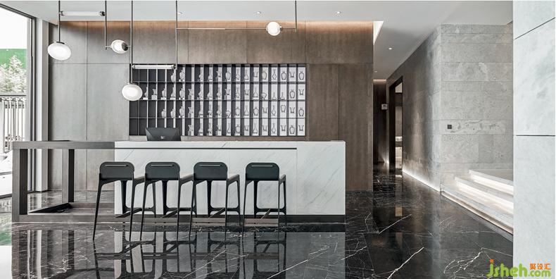 空間整體意境為明月如霜,涼風(fēng)如水。大面積的黑白灰詮釋出獨(dú)有的質(zhì)感令人心馳神往,一筆濃墨色彩,一縷風(fēng)流才華,放佛是自然中墨彩山水的濃縮,從黑色大理石的地面,由灰白色過(guò)渡到深棕色,層次漸進(jìn)種渲染著高貴儒雅的視覺(jué)效果。整體構(gòu)造出的平衡感,讓環(huán)境的一切融入自然景物之中,得一份悄然平靜的心緒,令所有俗世的喧囂,在此漸趨恬然。
