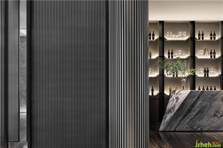 光線從墻面穿孔鋁板透出,運(yùn)用幾何線條元素、與山石吊飾造景形成獨(dú)特韻味,疏影斑駁靈動。摒棄多余的陳設(shè),以極具現(xiàn)代感的藝術(shù)裝置去迎合空間本身的靈動,搭出極具視覺沖擊力的多元層次,完成空間的藝術(shù)化表達(dá)。