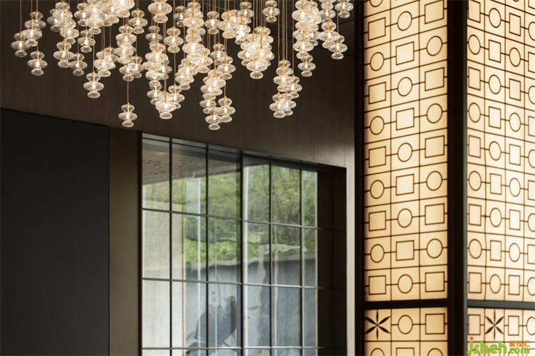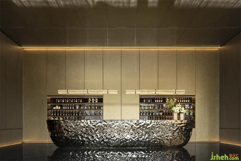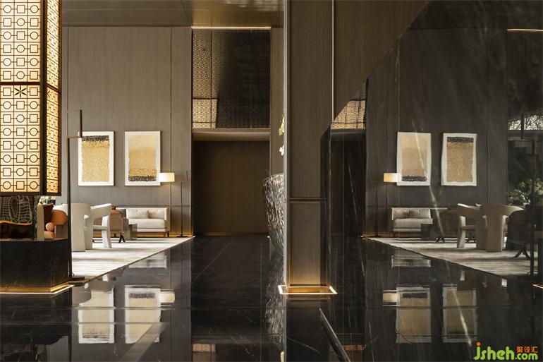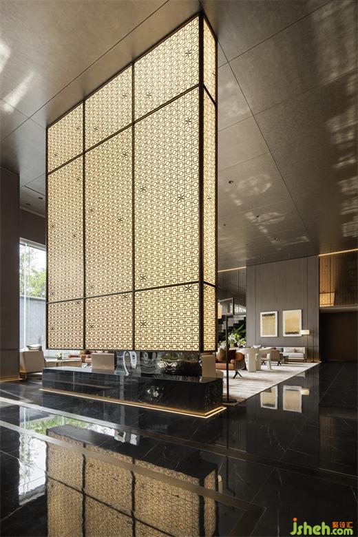 由寧波市市花山茶花演變而來的云石燈箱花紋,簡約的序列視覺感讓空間立體純粹,光線的擴散使氛圍增感強,平靜優(yōu)雅之余,亦多了一種光影和結構的表現(xiàn)。售樓處設計在黑與金的加持下,純粹精致感映入場景內(nèi)核。