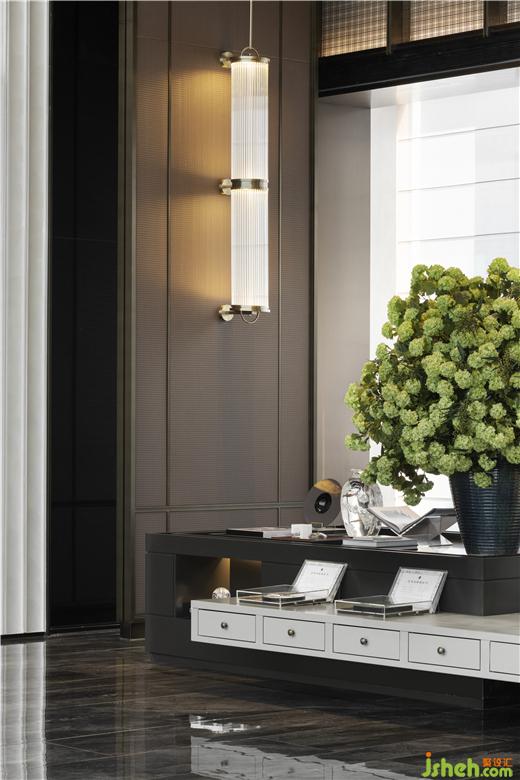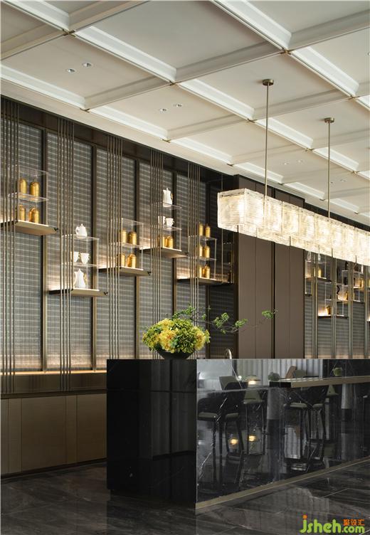 水吧臺(tái)兼具酒店式服務(wù),臺(tái)面石材紋理飽滿,燈光與地面陰影的轉(zhuǎn)變、頂面裝置互動(dòng),三者明暗不一、動(dòng)靜各異的變化,展示中心設(shè)計(jì)繪制出具象化的空間情緒。