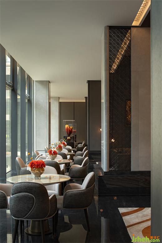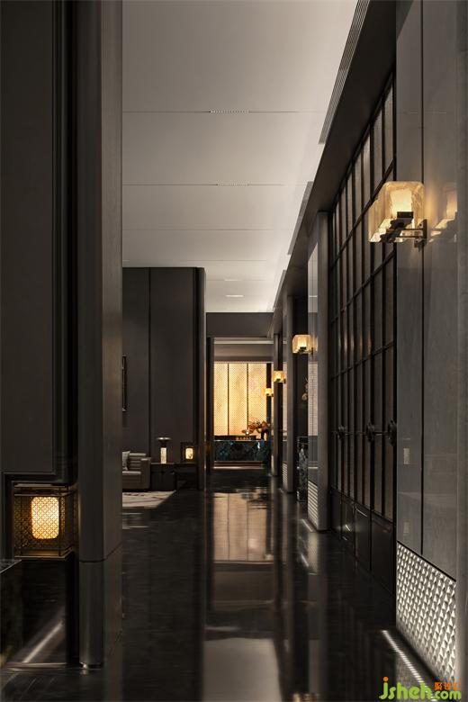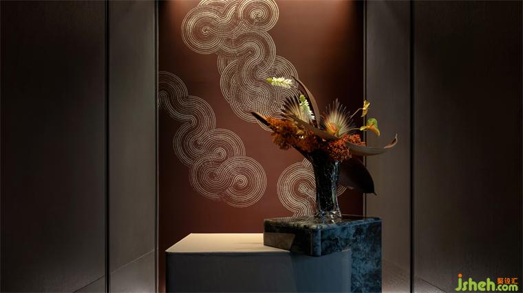 通高的空間尺度借鑒園林中的開闊與高遠(yuǎn),使空間顯得更加寬敞明亮,給人以無(wú)限遐想。水晶燈如月光傾灑而下,為大廳披上了一層神秘的銀紗,黑白的拼花地面又在光影的交錯(cuò)中凸顯空間層次和深度,與東方美學(xué)意境相得益彰。端景如園林中的亭臺(tái)以一種跨越時(shí)空的姿態(tài)成為空間焦點(diǎn),紅花的點(diǎn)綴增添了一絲不羈的靈動(dòng)。