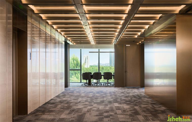 交易中心設(shè)計過道兩側(cè)采用白色透明的玻璃隔斷墻進一步保證了空間的通透性,灰色地毯沿著通道延伸,提供舒適的行走體驗外,轉(zhuǎn)向石材裝飾又強化了個別空間的私密性,整體深淺的色調(diào)變化在視覺上強化了空間功能區(qū)的層次轉(zhuǎn)變,形成邏輯清晰、層級分明的辦公場所。