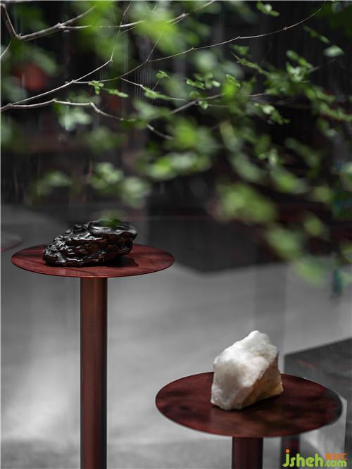 空間隨處可見(jiàn)不加修飾的石材和木材——有些以家居的形態(tài)體現(xiàn),粗糙的鑿面被保留下來(lái),構(gòu)成空間自然粗糲的質(zhì)感;而有些則用風(fēng)雨做它的鑿刀,自然沖刷的圓潤(rùn)或凹凸,以不同體量,貫穿其中,營(yíng)造游園的體驗(yàn);而木頭則坦誠(chéng)地舒展著它們來(lái)自天然的紋路,安放在每一次的觸感當(dāng)中。室內(nèi)設(shè)計(jì)師