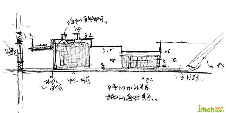 內(nèi)部的每個區(qū)域用多扇的門彼此連接。從入口的廊道進(jìn)入內(nèi)部的空間,依次經(jīng)過前區(qū)開放的區(qū)域和封邊的區(qū)域,廊道的墻壁使用天然的石材。天花被壓低,有種被邀請的和期待的情緒。