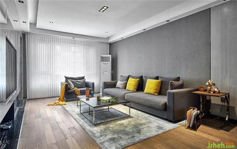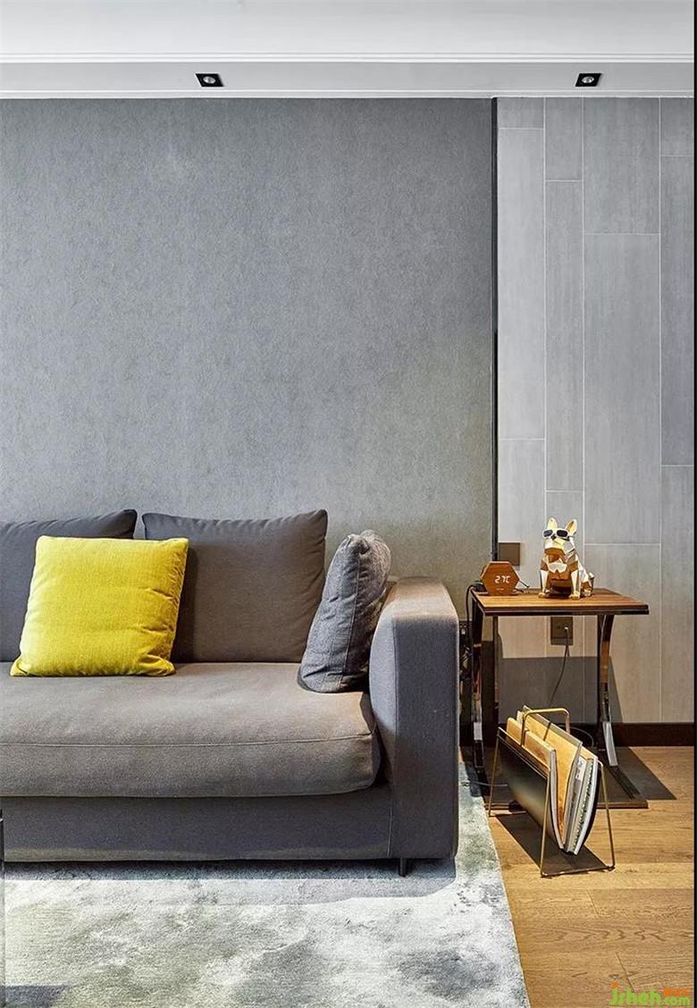 ▲灰色的布藝沙發(fā)和壁紙,使得客廳整體的色調(diào)更加和諧呼應(yīng)。原木色的地板、明黃色的沙發(fā)靠墊、以及邊桌上金色的裝飾擺件,都為這一空間增加了亮點,色彩鮮明得可謂恰到好處。