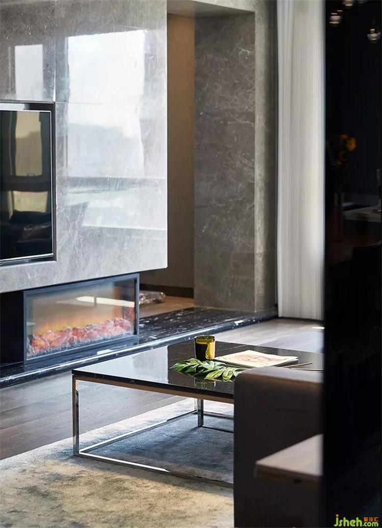 ▲電視背景墻采用了原始紋理的石材鋪設(shè),其中又匠心獨特地嵌入了一組壁爐,幾塊隨意堆砌的木柴。原本大氣硬朗的一隅,更添了幾分火熱的溫情。