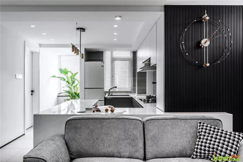 設(shè)計師將廚房原有的非承重墻面拆除,盡可能地把廚房一側(cè)的光線引入客廳,增加了視覺上的空間縱深感。