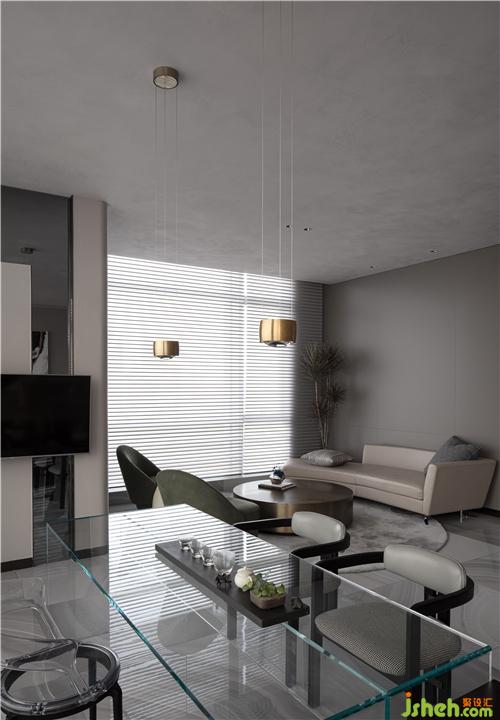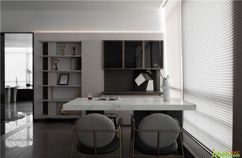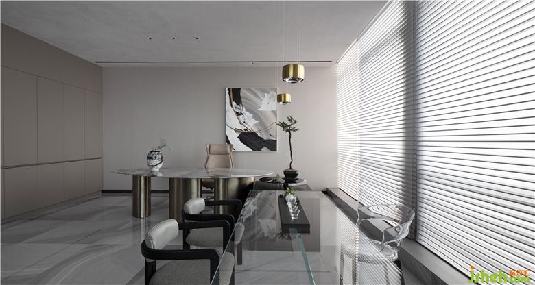 總經(jīng)理辦公室營(yíng)造的是一個(gè)簡(jiǎn)約輕奢又帶有淡淡中式文化底蘊(yùn)的空間,掛畫(huà)、大班臺(tái)石材臺(tái)面、花瓶、地磚等表面波浪紋理形成了一種水墨流淌的氣息,橢圓的大班臺(tái)和圓形的茶幾讓空間更為柔和親切,超白玻璃茶臺(tái)搭配簡(jiǎn)約的原石茶具,還有造型精致的德國(guó)原裝進(jìn)口OCCHIO小吊燈,讓整個(gè)空間顯得干凈而且統(tǒng)一,隨著百葉狀香格里窗簾除除升起,窗外開(kāi)闊的景觀躍然眼前,置身其中,有一種忘卻浮世繁華的寧?kù)o。