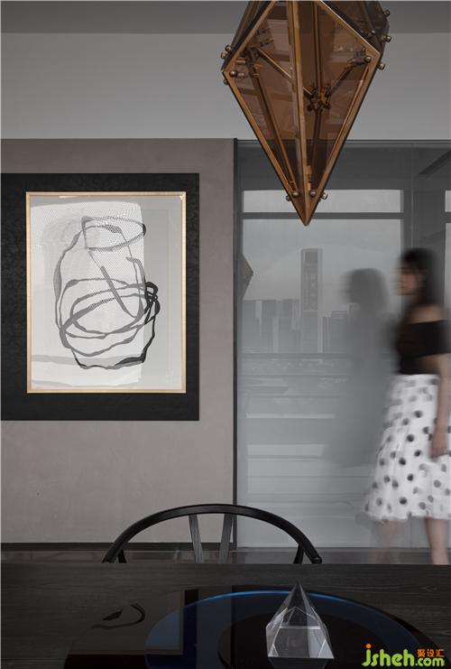 辦公區(qū)與共享空間之間是一面絲印漸變玻璃,讓辦公區(qū)既能享受戶外的景色與陽(yáng)光,同時(shí)又具備一定的私密性,還避免了東向早上強(qiáng)烈的陽(yáng)光照射。會(huì)議桌上寶石形狀的吊燈又如金色水滴,下方的三色圓形亞克力組合裝置彷如水滴泛起的漣漪,在燈下形成光影交錯(cuò),辦公室設(shè)計(jì)帶動(dòng)了空間的靈性。